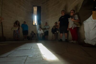 Ocurre en la conocida como “Sala de la Prisión”, en el segundo cuerpo de la torre del Micalet, poco después de las 10 de la mañana: a través de una de las ventanas entran unos rayos solares y se alinean proyectándose en el suelo durante unos diez minutos. “Se trata de un efecto para el que fue diseñada esa ventana en el siglo XIV en homenaje a la titular de la Seo”, añade Llop