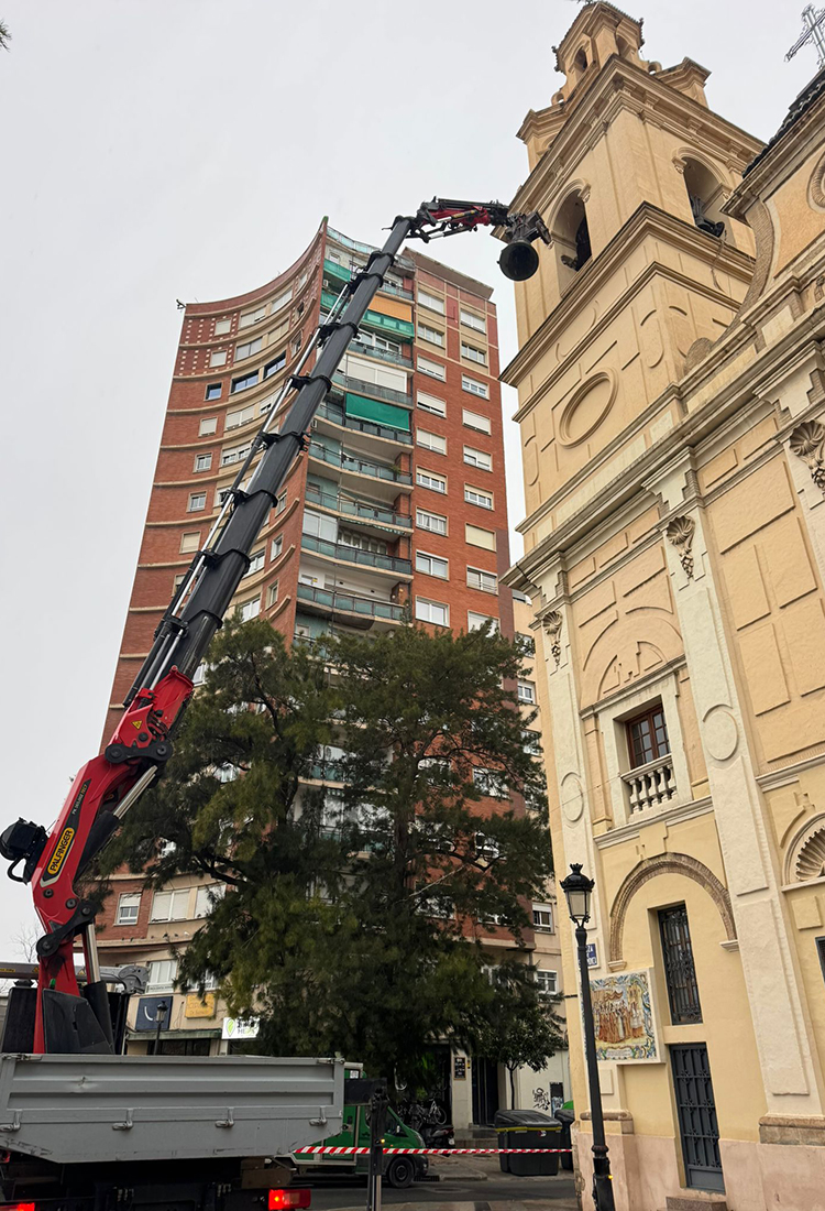 La iglesia de El Salvador y Santa Mónica de Valencia ha acogido la bajada de seis de sus siete campanas, de la torre campanario, para a partir de ahora iniciar un proceso de restauración y conservación, que llevará a cabo la empresa Relojes y Campanas 2001.