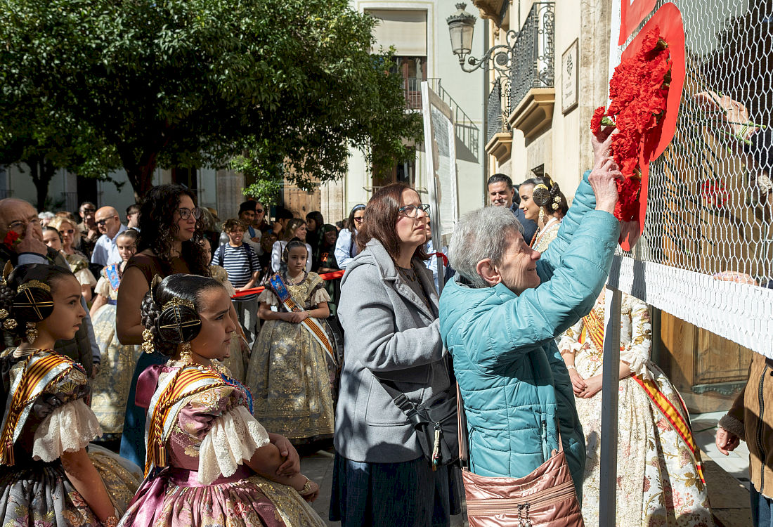 Finalmente, las FFMM y sus Cortes de Honor han realizado una simbólica ofrenda fallera de claveles rojos con los que han confeccionado el logo de la entidad.