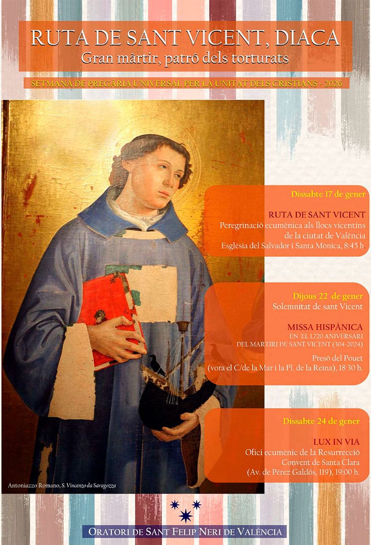 El sábado 17 de enero, tendrá lugar la tradicional ruta ecuménica de San Vicente, con motivo de la próxima festividad del santo. El recorrido se iniciará en la parroquia de Santa Mónica, a las 8:45 horas, y acabará en la parroquia de Cristo Rey.