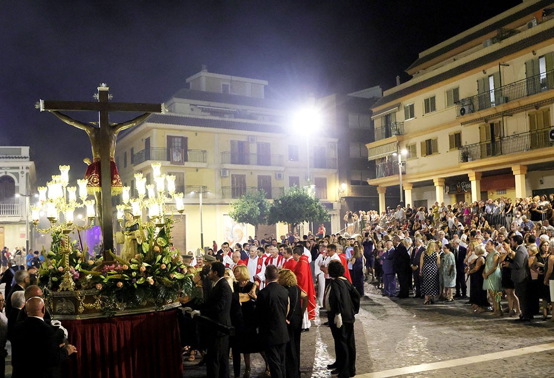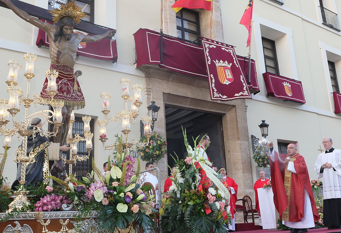 El pasado domingo , los actos comenzaron con una mascletá en el parque Central, que contó con la presencia especial del Santísimo Cristo de la Fe. Por la tarde, la imagen fue trasladada desde la parroquia de San Pedro Apóstol hasta la Plaza Ingeniero Castells, donde tuvo lugar la solemne eucaristía. En esta ocasión especial, la imagen del Cristo de la Fe llevó el faldellín que “portó hace cien años, que pudo ser rescatado, y ha sido restaurado en un taller de Málaga, gracias a una familia devota”, señalan desde la Real Cofradía. Al finalizar, la imagen fue trasladada en procesión hasta la parroquia.
