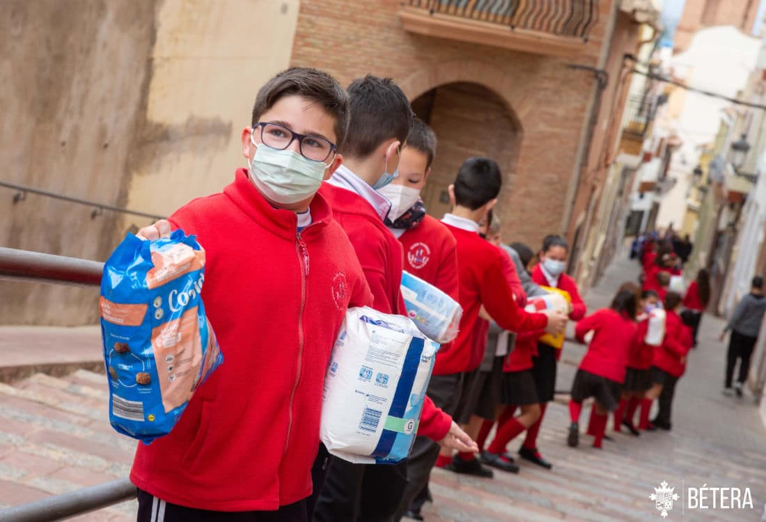 Los alumnos, cerca de 180 niños y niñas de Educación Primaria, iniciaron la cadena en la parroquia La Purísima Concepción de Bétera, de la que depende el centro escolar, repartidos, uno a uno, en fila por un camino de cerca de 80 metros, con cuesta empinada hasta el Ayuntamiento, punto receptor, en donde iban depositando las bolsas y cajas.