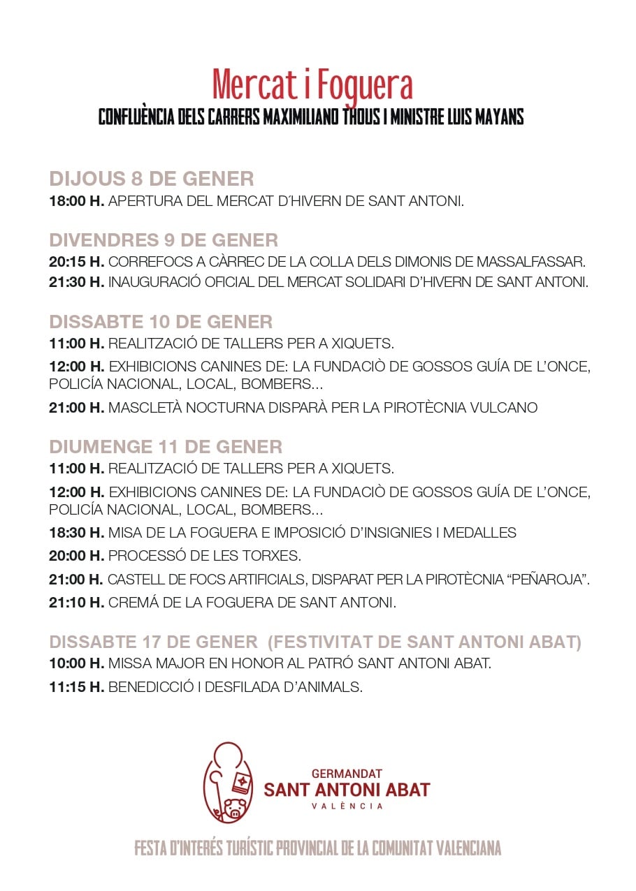 Posteriormente, a las 20 horas, se desarrollará la procesión con la imagen del santo acompañada con antorchas y por las tradicionales dançaes, amenizadas por tabalet y dolçaina desde la puerta de la parroquia hasta el lugar del encendido de la foguera en honor al Santo que será a las 21 horas.