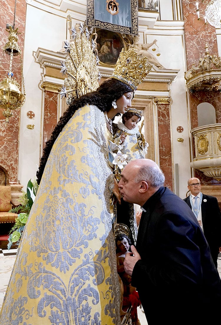 El Arzobispo de Valencia, monseñor Enrique Benavent, participó ayer en el Besamanos público a la Virgen de los Desamparados, acercándose en dos ocasiones para rezar ante la imagen de la Mare de Déu en su Basílica, que cerró las puertas a las dos de la madrugada tras el paso de cerca de 33.000 fieles a lo largo de toda la jornada.