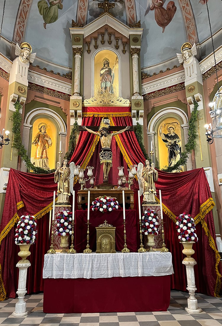 Además, durante estos días se celebrará un triduo extraordinario en la parroquia de San Isidro, para lo cual se ha preparado un altar de cultos solemne que evocará las antiguas celebraciones tradicionales. La imagen del Cristo presidirá el templo con un montaje ceremonial que incluirá cortinajes, candelabros y elementos litúrgicos al más puro estilo barroco festivo valenciano.