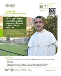 La Facultad de Teología San Vicente Ferrer de la Universidad Católica de Valencia ha organizado el seminario ecuménico e interreligioso En diálogo, porque somos buscadores y no poseedores de la Verdad que nos salva, con fray Claudio Monge OP. El encuentro, preparado por la Cátedra de ecumenismo Yves Congar y el Observatorio de las Religiones-UCV, será el martes 25 de noviembre, desde las 10:00 horas, en el Aula Magna de la sede Trinitarios de la UCV.