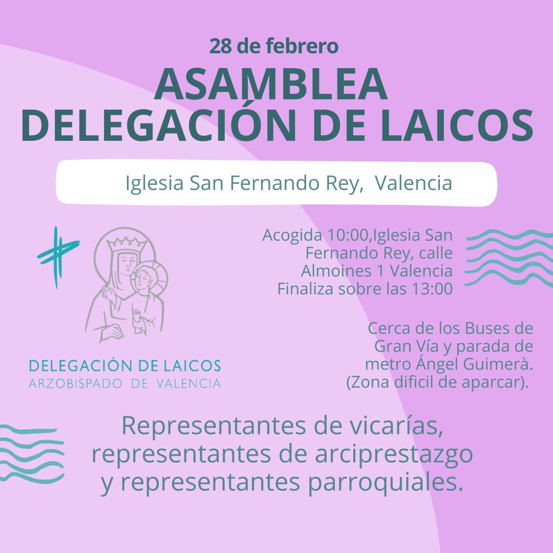 La Delegación Diocesana de Laicos celebrará el próximo 28 de febrero su asamblea general con la participación de responsables de laicos de parroquias, arciprestazgos y vicarías de la diócesis de Valencia. El encuentro tendrá lugar a partir de las 10 horas en la parroquia San Fernando Rey de Valencia, ubicada en la calle Almoines, 1.