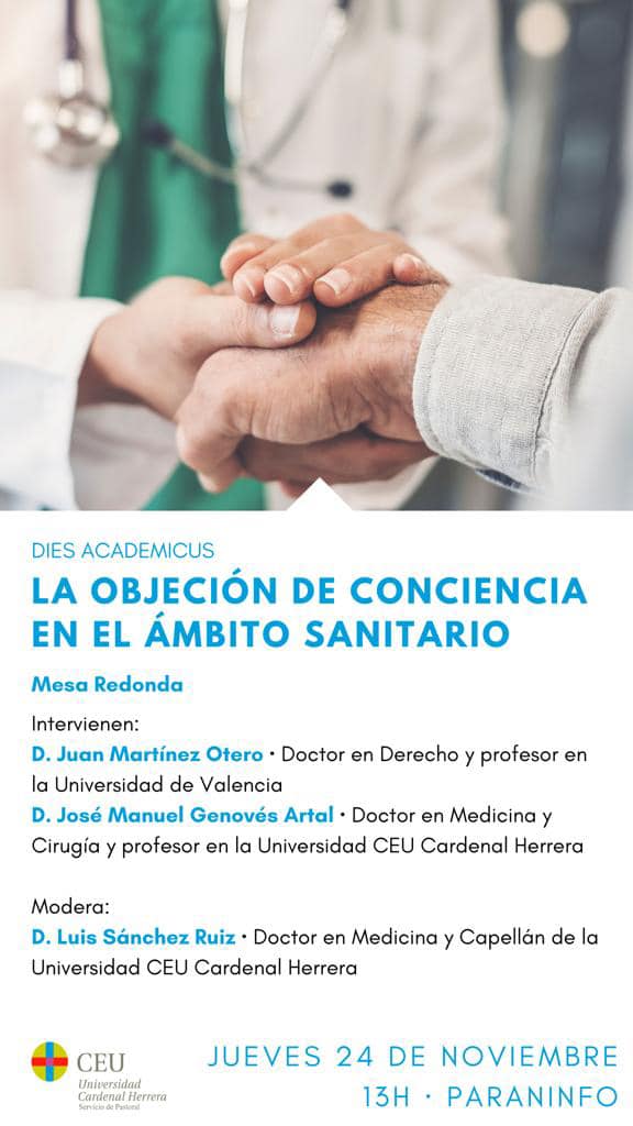 Este jueves, 24 de noviembre, a las 13 horas, el Paraninfo de la Universidad CEU Cardenal Herrera acogerá la primera sesión del ciclo Dies Academicus del curso 22-23. En esta ocasión, los profesores Juan Martínez Otero, Doctor en Derecho, y José Manuel Genovés, Doctor en Medicina y Cirugía, intervendrán en la mesa redonda “La objeción de conciencia en el ámbito sanitario”, moderados por Luis Sánchez Ruiz, Doctor en Medicina y Cirugía y capellán de la Universidad.