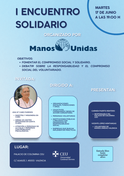 El primer Encuentro Solidario de Manos Unidas Valencia será este martes, 17 de junio, a las 19:00 horas. Inaugurará el acto Carmen Puerto Rentero, Responsable del Palacio de Colomina CEU y moderará Vicente López Hontangas, voluntario de Manos Unidas Valencia. Estos encuentros se abren con una mujer que trabaja contra las desigualdades y las injusticias de las personas más empobrecidas en Cuba.
