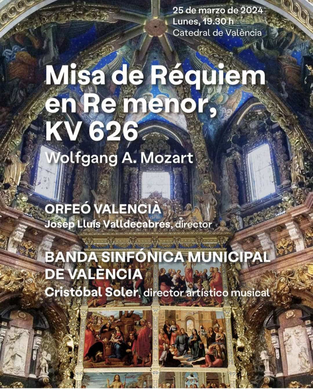 25 Mar 2024 La Catedral acoge un concierto de música sacra, la “Misa de Réquiem” de Mozart A cargo de la Banda Sinfónica Municipal de Valencia y el Orfeó Valencià