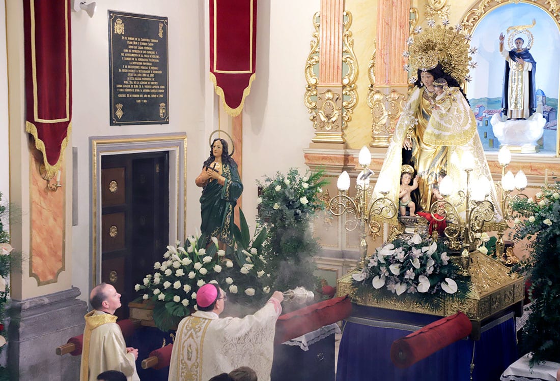 La imagen ha sido recibida por la imagen del Santísimo Cristo de la Junquera y, una vez en la iglesia parroquial, se ha celebrado la misa del último día de la Novena, presidida por el Obispo auxiliar de Valencia monseñor Fernando Ramón Casas. En ella ha cantado la Escolanía de la Virgen de los Desamparados dirigida por Luis Garrido.