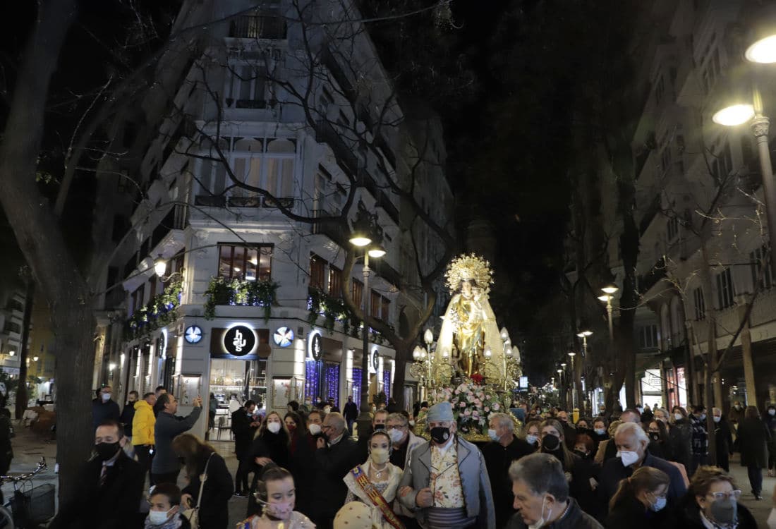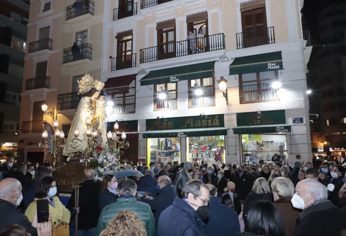 La imagen de la Virgen de los Desamparados llegando a la parroquia por la calles San Vicente (Foto: F. Perona)