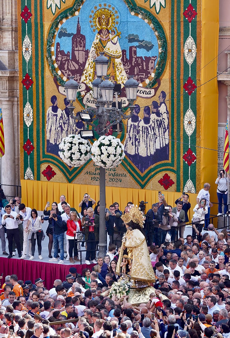 Después de la missa “d’Infants” la imagen ha salido de su Basílica y ha sido trasladada hasta la Catedral de Valencia por donde ha entrado por la puerta de los Hierros de la Seo donde se ha celebrado a las doce del mediodía la misa de Pontifical presidida por el Arzobispo de Valencia.