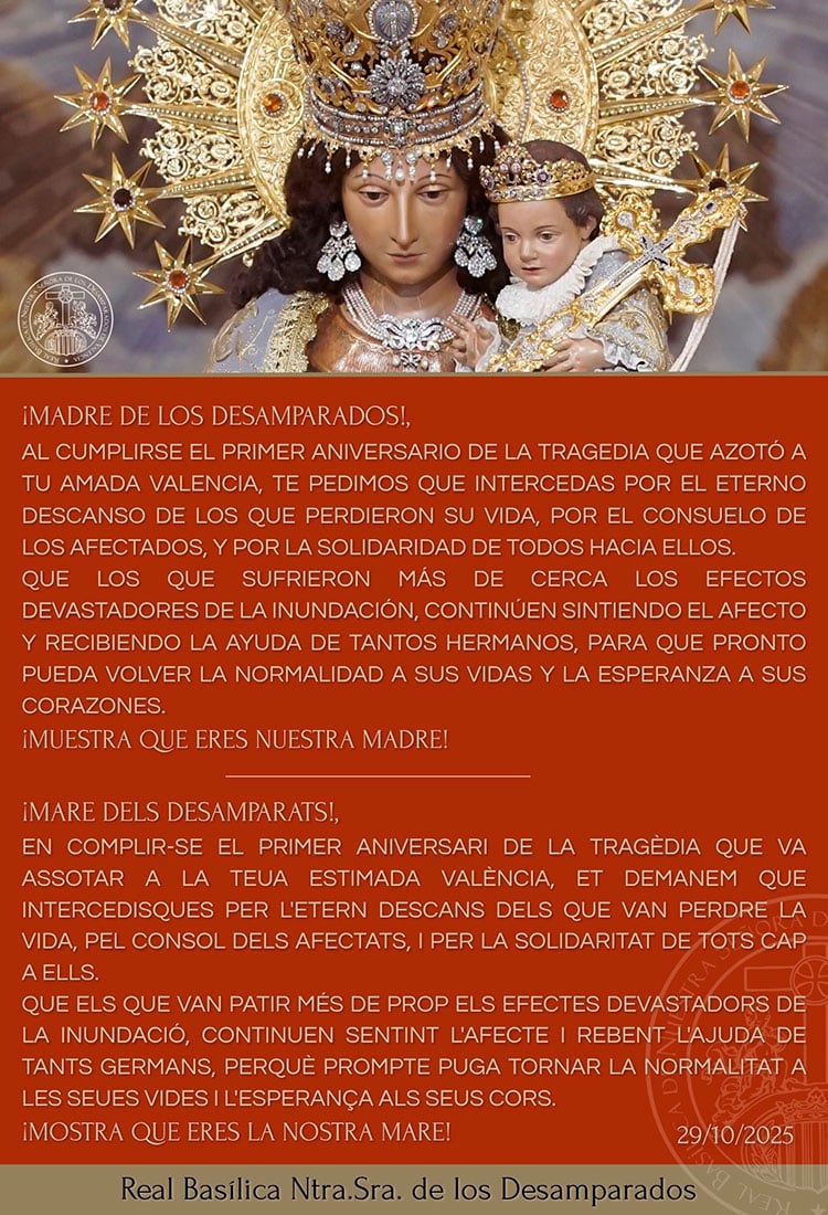 La Real Basílica de la Virgen de los Desamparados ha elevado una oración a la Mare de Déu en el primer aniversario de la DANA, en la que pide la intercesión de la Mare de Déu para que «los que sufrieron más de cerca los efectos devastadores de la inundación, continúen sintiendo el afecto y recibiendo la ayuda de tantos hermanos, para que pronto pueda volver la normalidad a sus vidas y la esperanza a sus corazones. !Mostra que eres la nostra Mare!», concluye.