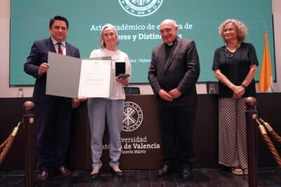 Asimismo, como ha señalado en el acto de entrega el arzobispo de Valencia, Enrique Benavent, “hemos querido hacer este reconocimiento porque también la misión de una universidad tiene que terminar en la vida. Una universidad como ésta prepara personas. La mayoría de nuestros alumnos ejercerán una profesión, pero en la UCV no sólo se quiere enseñar aquello que tienen que hacer, sino también cómo lo tienen que hacer”.
