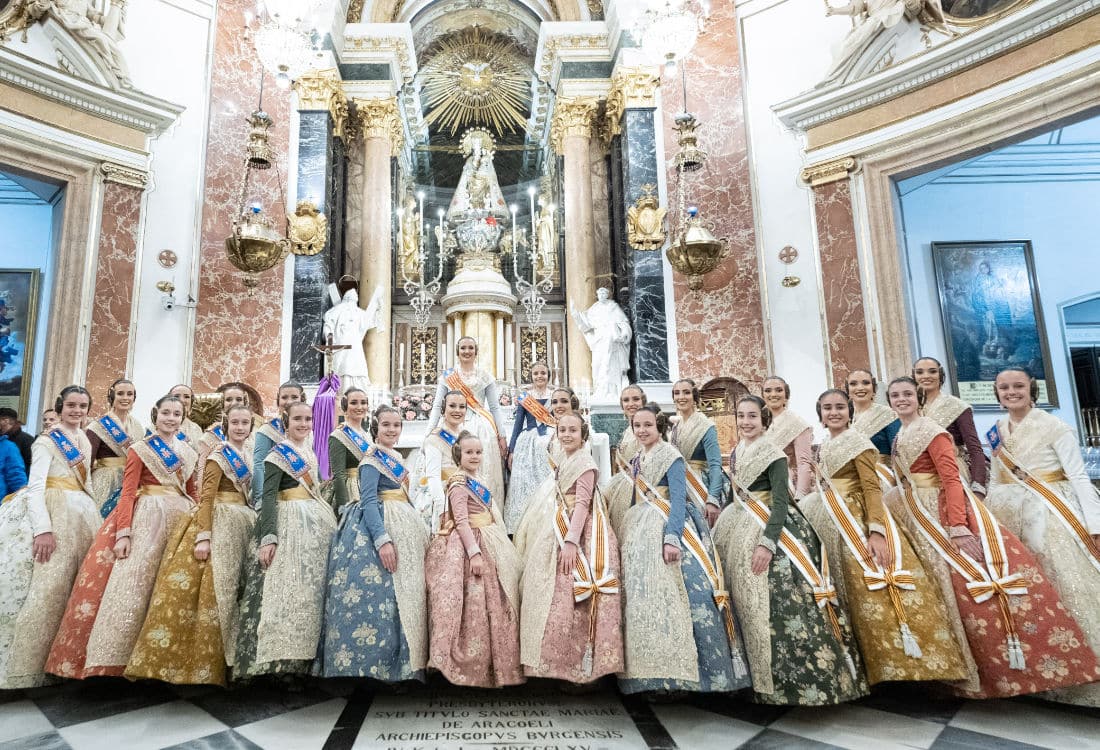 27 Feb 2023 Las Falleras Mayores de Valencia ofrecen sus ramos a la Mare de Déu en su Basílica después de la “Crida” Fueron recibidas por el rector Melchor Seguí