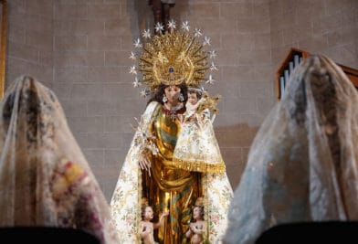 Las falleras mayores han realizado el besamanos a la imagen peregrina de la Virgen esculpida por Carmelo Vicent en el año 1945 y que ha sido restaurada por el artista Pedro Arrúe.