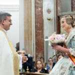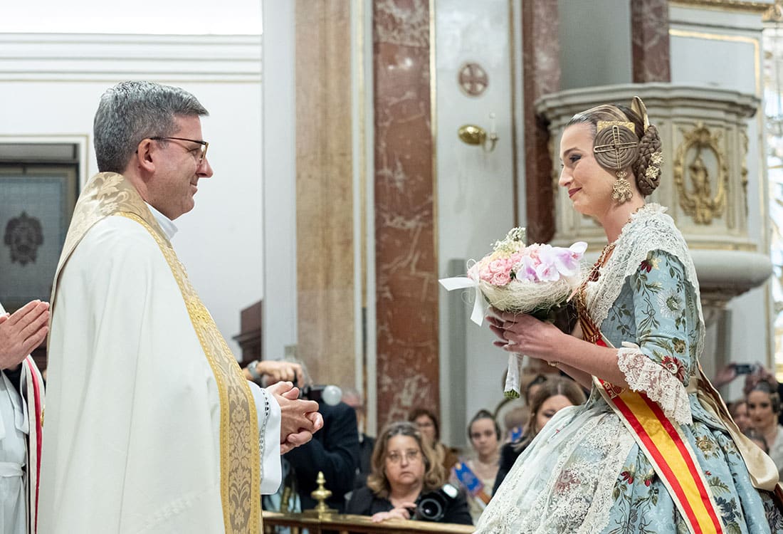 - El rector de la Basílica, Melchor Seguí, recibe el ramo de manos de la Fallera Mayor de Valencia (V.Gutiérrez / Medios Comunicación Arzobispado de Valencia)