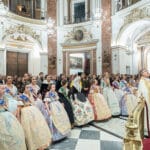 Las Falleras Mayores de Valencia, acompañadas de sus Cortes de Honor y miembros de la Junta Central Fallera, fueron recibidas por el rector de la Basílica de la Virgen de los Desamparados, Melchor Seguí, y por el vicerrector, Álvaro Almenar.