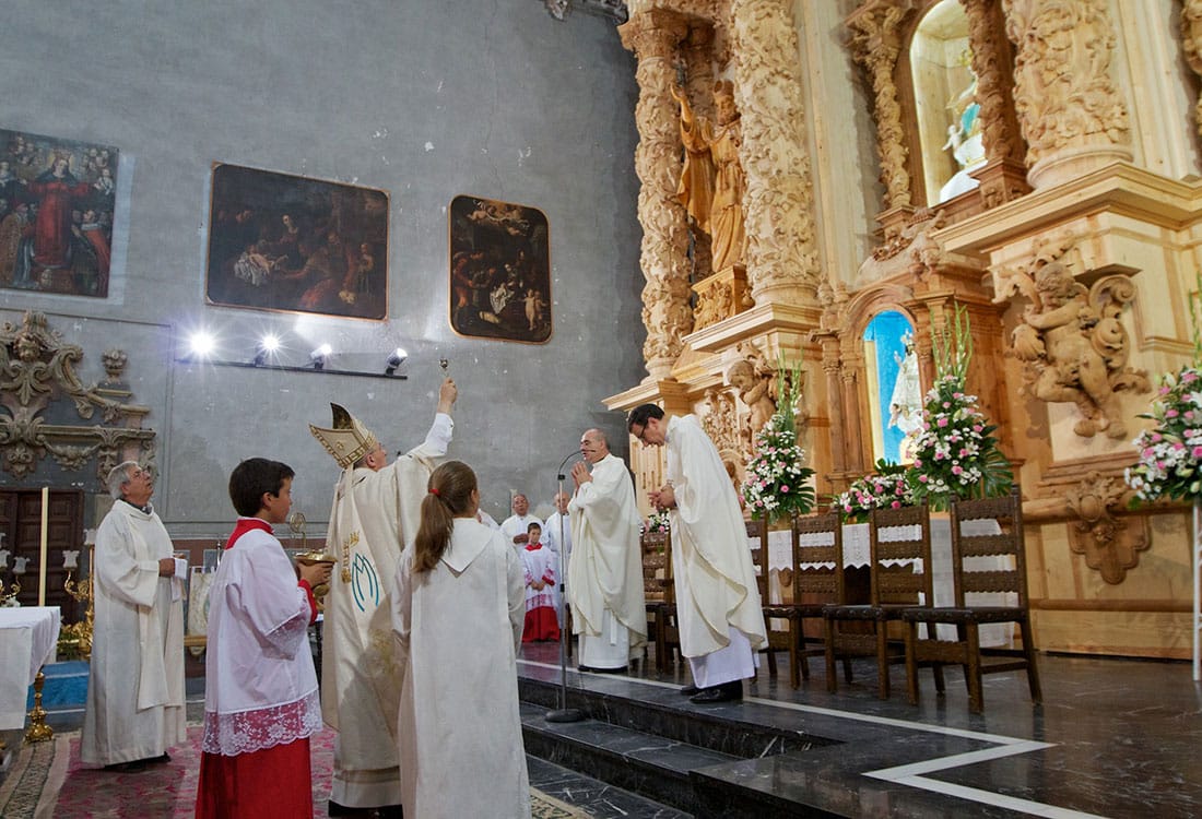 Foto archivo de 2013 de la bendición de la segunda fase de la restauración del retablo, por el entonces Arzobispo, Carlos osoro. (Foto: V. Gutiérrez/Delegación Medios Comunicación Arzobispado Valencia)