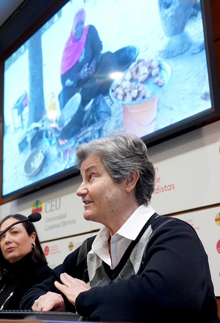 María Gómez-Lechón, misionera de las Hijas de la Caridad de San Vicente de Paul, (socio local de Manos Unidas en Mozambique), compartió la difícil situación que sufren los pueblos de Mozambique donde lleva trabajando desde 2003. Comenzó en Maputo en el Centro de Acogida para los Huérfanos de Sida donde “amparábamos unos 200 niños solos cuyos padres habían fallecido de VIH. Es una zona donde los hombres emigran a Sudáfrica para trabajar en las minas. Unos no regresan, otros vuelven con el virus que contagian a la familia. Los niños son los más vulnerables, incluso viven solos.” Las hermanas cubren las necesidades básicas de alimento, cobijo, sanidad y escolarización de los niños.