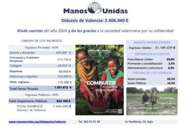 Un año más los ingresos privados han supuesto en Manos Unidas Valencia, y en todo Manos Unidas, la principal fuente de financiación, por lo que esta ONG puede decidir sus proyectos de forma independiente, mediante un equipo de técnicos que, de forma objetiva, buscan el mayor impacto positivo en las poblaciones beneficiarias. Los ingresos provenientes del sector público experimentaron un fuerte incremento en 2024 respecto año anterior.