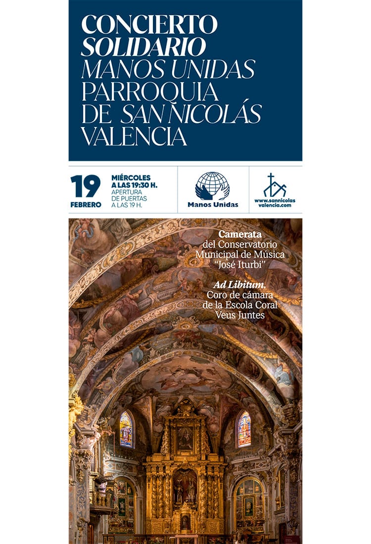 La Parroquia de San Nicolás de Valencia acogerá el próximo miércoles 19 de febrero, a las 19:30h, un concierto solidario organizado por Manos Unidas. La recaudación íntegra del evento se destinará a los proyectos activos de la ONG, enfocados en la lucha contra la pobreza y el hambre en el mundo.