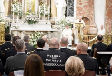 El arzobispo de Valencia, monseñor Enrique Benavent, presidió este martes, en la Basílica de la Virgen de los Desamparados, la misa organizada por la Policía Local de Valencia con motivo de la festividad de su patrón, el Santo Ángel de la Ciudad.