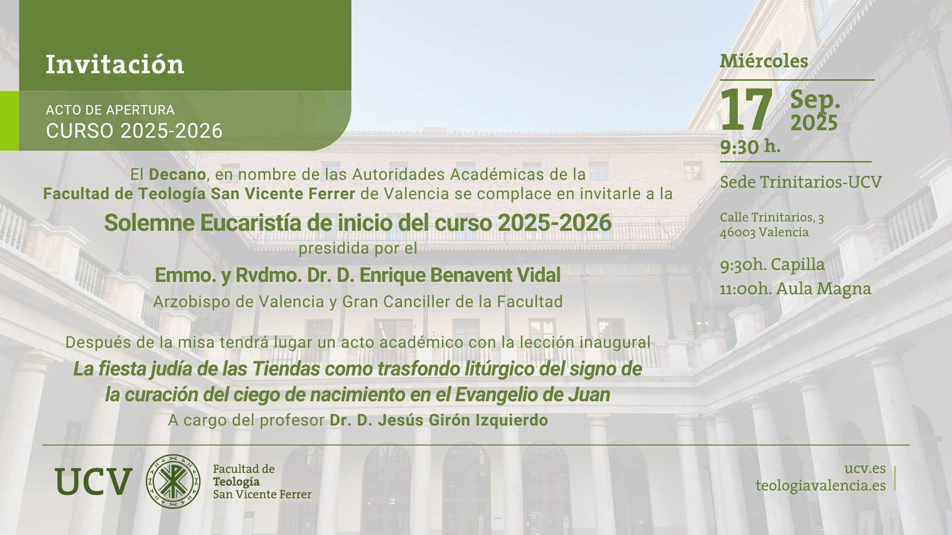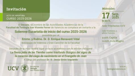 En este acto de inicio de curso están invitados a participar todos los profesores, alumnos y personas de administración y servicios de la Facultad de Teología de Valencia. Por este motivo, se suspenderán las clases de la mañana del miércoles 17 de septiembre.