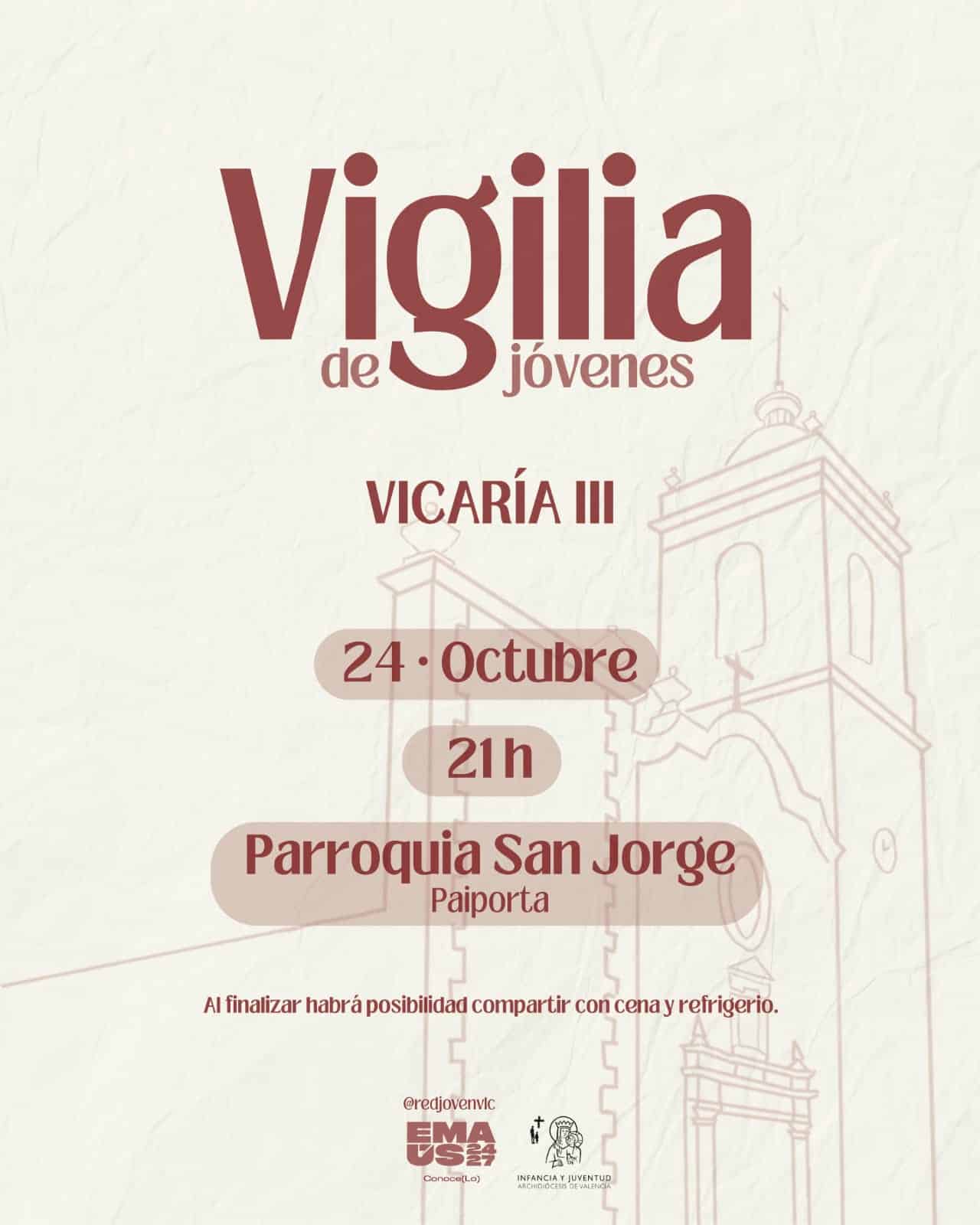 Este encuentro de oración dirigido a los jóvenes de la Vicaría III, tendrá lugar en la parroquia de San Jorge de Paiporta a partir de las nueve de la noche. Las vigilias son organizadas por la delegación de Infancia uy Juventud del Arzobispado.