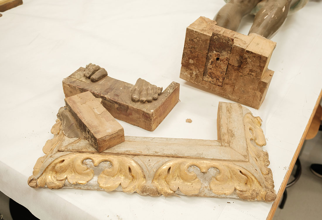 Así, entre otras zonas, las piezas talladas correspondientes a los dedos y al lateral del pie derecho se separaron y la acción del agua ocasionó pérdidas de policromía.