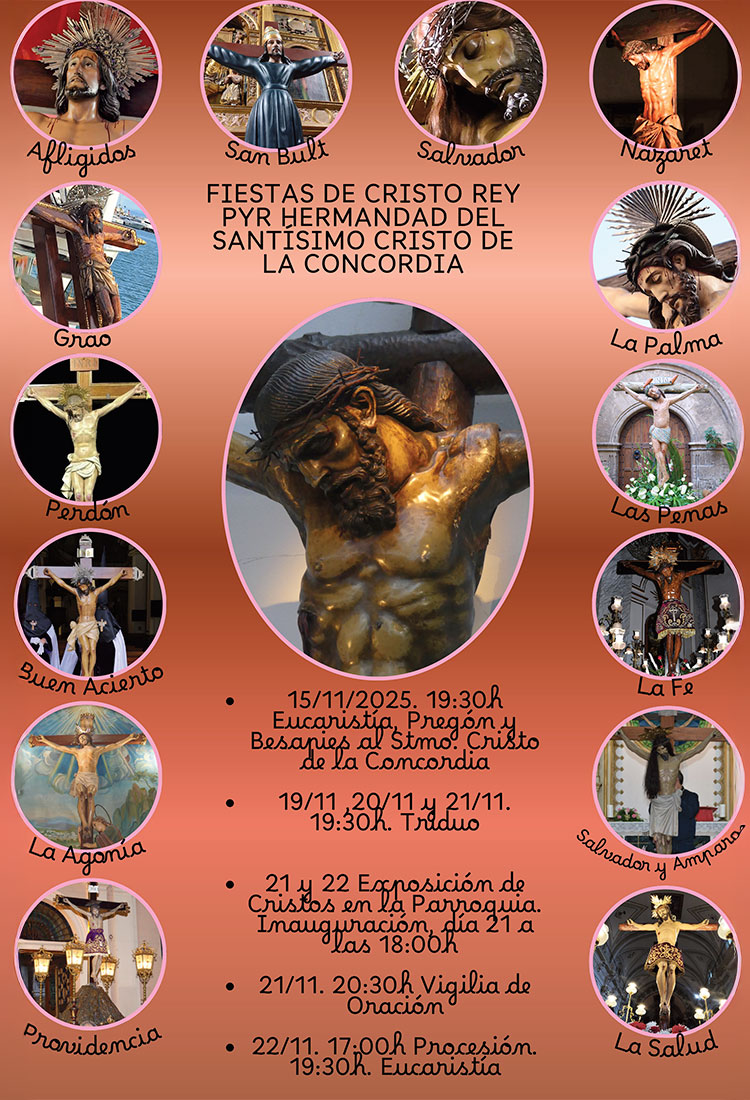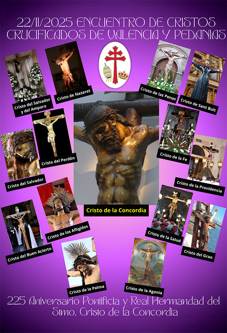 La Pontificia y Real Hermandad del Santísimo Cristo de la Concordia celebra este año su 225 aniversario, una efeméride muy especial para la Semana Santa Marinera de València. Con motivo de esta conmemoración, la Hermandad ha organizado un amplio programa de actos que culminará el sábado 22 de noviembre con una gran procesión en la que participarán quince Cristos crucificados procedentes de distintas parroquias de la ciudad.
