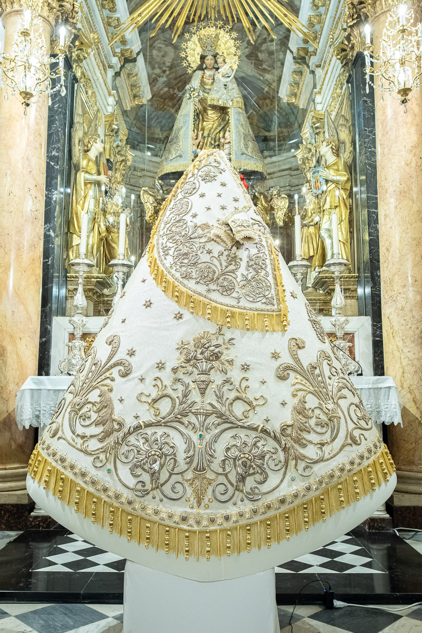 Este manto lo ha llevado en numerosas ocasiones tanto la imagen procesional o peregrina de la Virgen como la original que preside la Basílica y, dada su importancia, en 1934 el artista valenciano Ramón Stolz lo reprodujo en el lienzo bocaporte que cubre la hornacina del Altar Mayor. Como nos explica el director del Museo Mariano de la Virgen, Néstor Olucha, este manto se salvó de los saqueos de la contienda porque precisamente se encontraba en un taller restaurándose y cuando terminó este proceso de restauración coincidió con el fin de la guerra así es que se lo colocaron a la Virgen para su regreso de nuevo a la Basilica después de permanecer oculta en el Ayuntamiento.