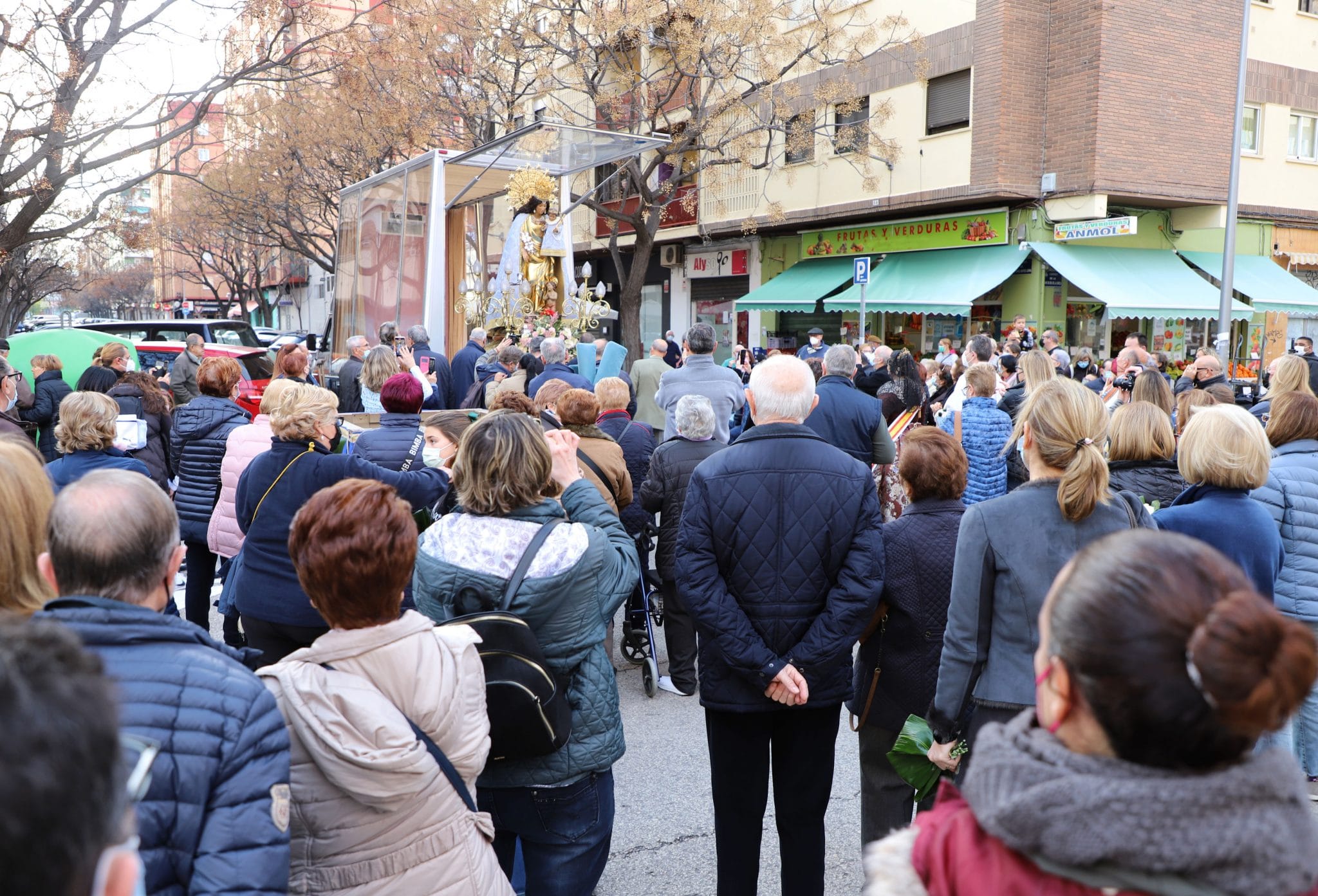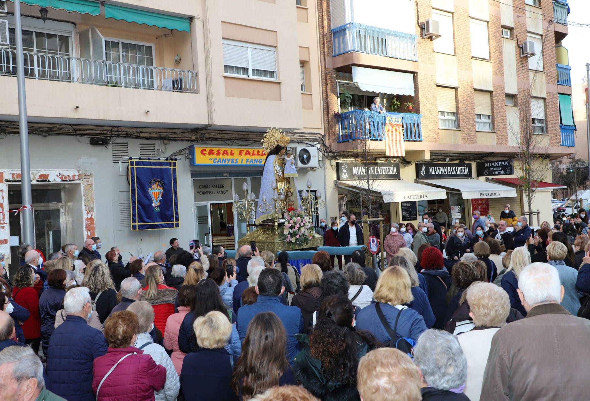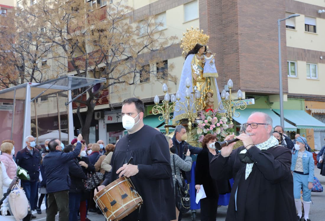 La Mare de Déu fue acogida con una oración, la bendición del Casal, y una ofrenda floral por numerosos falleros, feligreses y vecinos del barrio. La “Asociación Cultural Tio Vaina de Tabal i dolçaina i Cant d’Estil” le ofreció también Cants d’Albaes.
